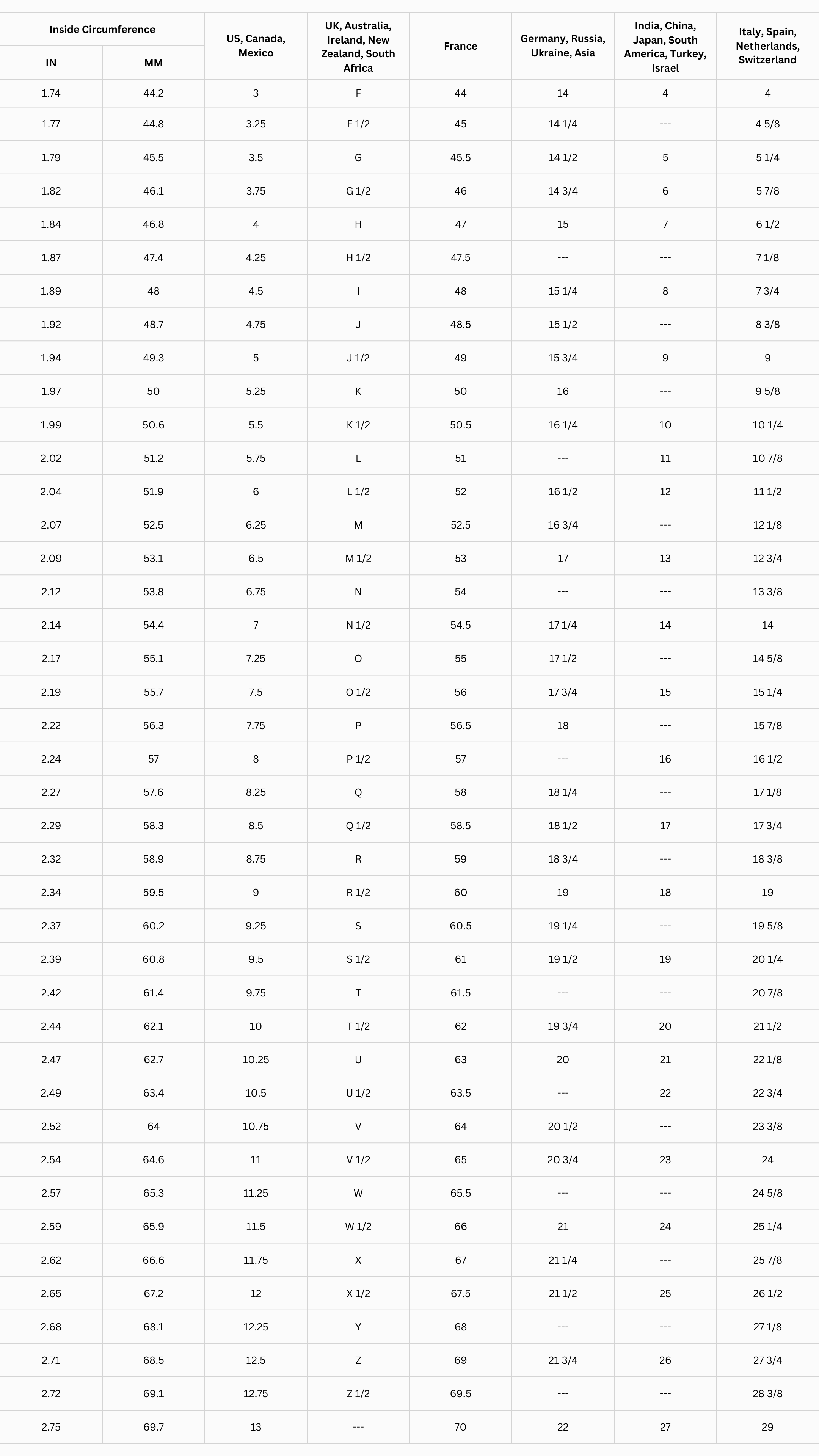 All of our rings are crafted in standard US sizes. View the chart below to see how US sizes map to finger circumference and convert to international sizes. Engagement rings, wedding bands, and fashion rings all follow the same size format.